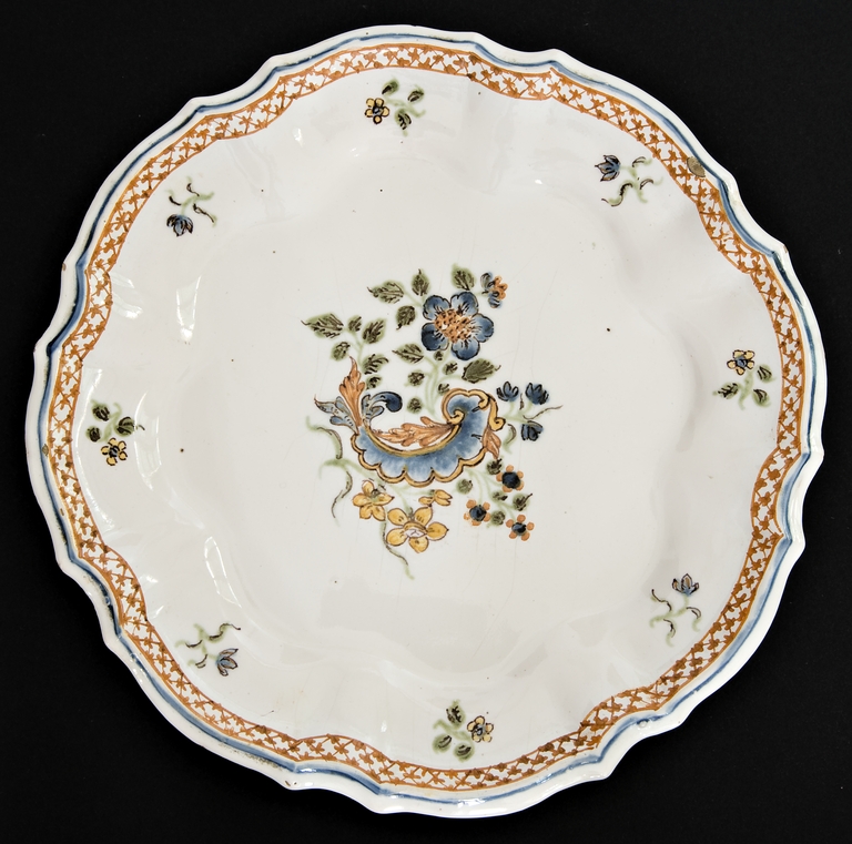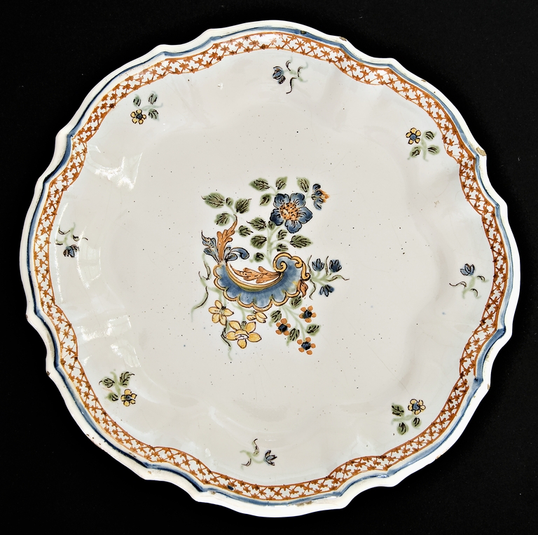 Fanno parte della serie di tre piatti settecenteschi attribuibili alla manifattura sassolese Dallari, in maiolica policroma a gran fuoco con decoro a rocaille e rametti fioriti. I tre piatti, di cui due in coppia e uno di maggiori dimensioni, presentano una forma elegantemente sagomata. La curvatura dell’orlo si differenzia dal più consueto movimento che alterna “segmenti rettilinei” a “due lobi congiunti a mo’ di graffa”