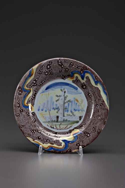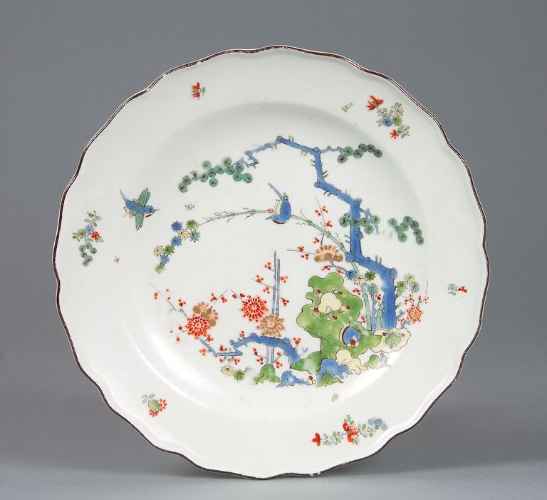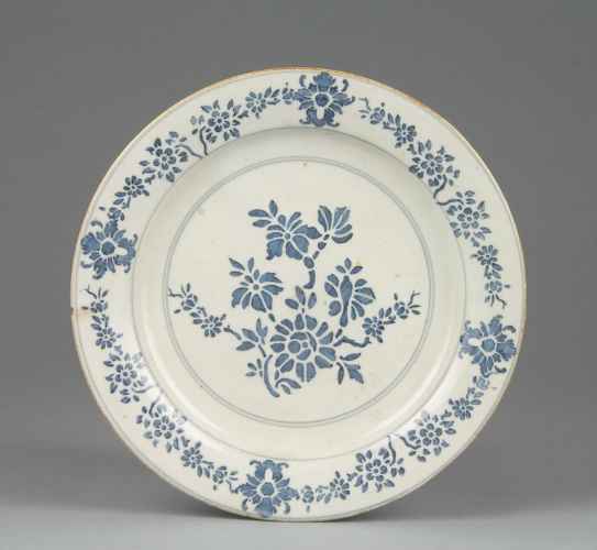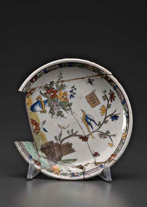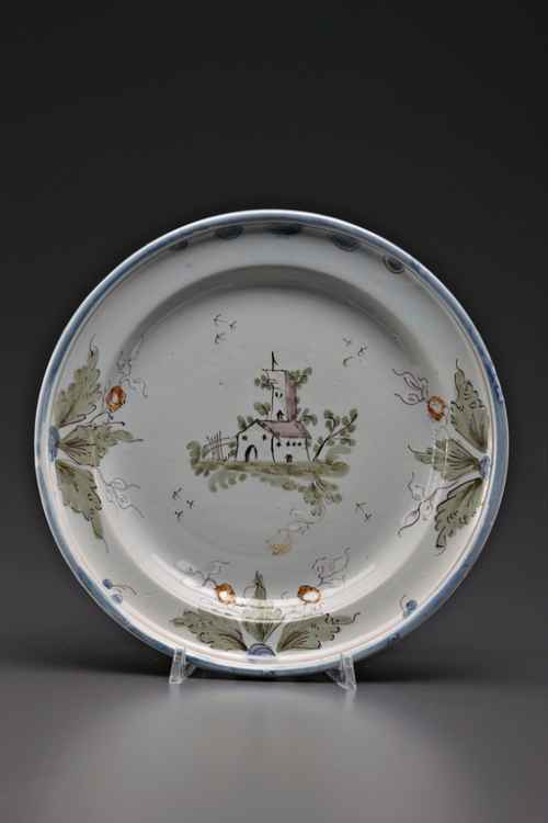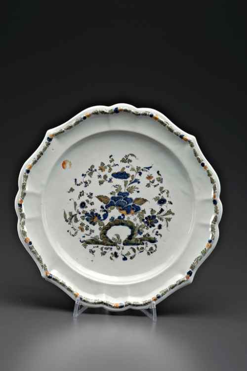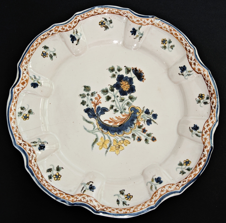 Fa parte della serie di tre piatti settecenteschi attribuibili alla manifattura sassolese Dallari, in maiolica policroma a gran fuoco con decoro a rocaille e rametti fioriti. I tre piatti, di cui due in coppia e uno di maggiori dimensioni, presentano una forma elegantemente sagomata. La curvatura dell’orlo si differenzia dal più consueto movimento che alterna “segmenti rettilinei” a “due lobi congiunti a mo’ di graffa”