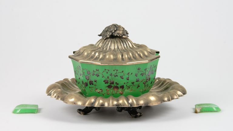 tipo di decoro – a rocaille e rametti fioriti – con la tesa dalla curvatura mistilinea esterna ripresa nel