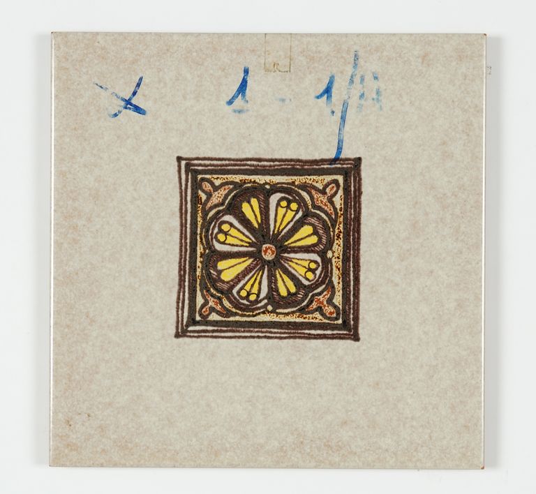 Prototipo: piastrella decorata al centro con un rosone inserito in un riquadro profilato da 3 fasce. Dipinta in arancio, bruno e giallo su un leggero smalto biancastro che lascia intravedere il colore del biscotto. Sul recto sono presenti tratti a pennarello blu, poco leggibili, che riportano "X 1 – 1/H".