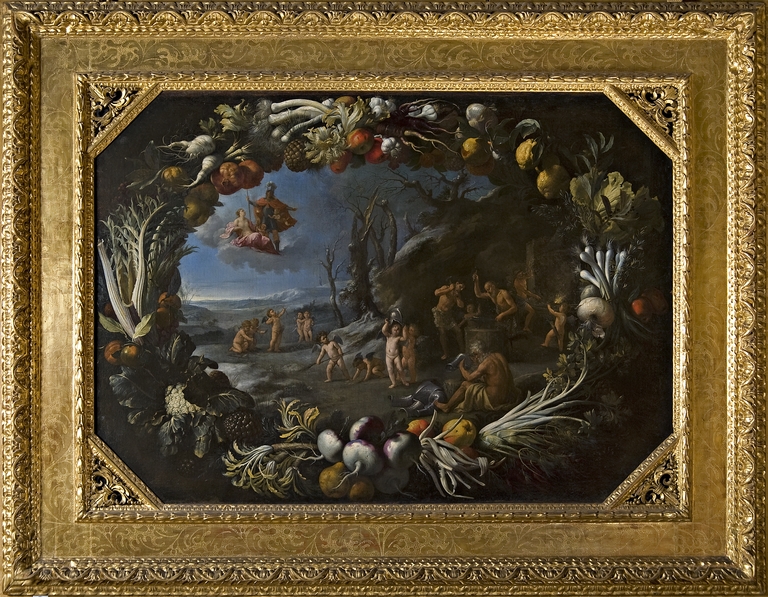 Una ghirlanda dipinta ad elementi vegetali, intrecciati a ortaggi tipici della stagione invernale, racchiude un paesaggio spoglio, popolato da amorini che giocano con strali ed armature appena forgiate da Vulcano. sulla nube in alto si trovano Venere e Marte.