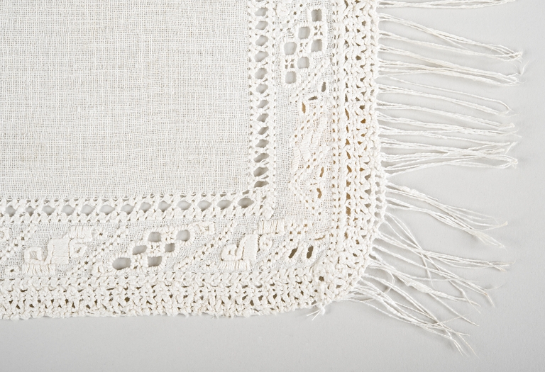 Tessuto con bordo e tramezzo a sfilatura e punto tagliato. Frangia.