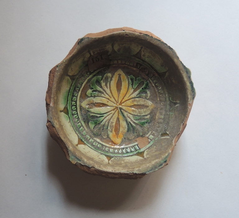 Frammento di scodella (tesa mancante) a cavetto emisferico e piede a disco. Al recto la decorazione è costituita al centro del cavetto da un fiore stilizzato a quattro petali e quattro foglie, entro un medaglione circolare con motivo geometrico circondato da un motivo a cunei. La terracotta è graffita e dipinta in verde-ramina e giallo-ferraccia.
