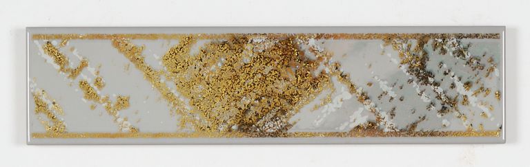 Listello smaltato in grigio tortora lucido e decorato serigraficamente a terzo fuoco con bianco, lustro iris e oro.