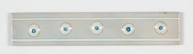 Listello decorato con 5 semisfere, di smalto bianco in rilievo, decorate in bianco e azzurro e due filetti bianchi lungo i lati orizzontali su fondo grigio.