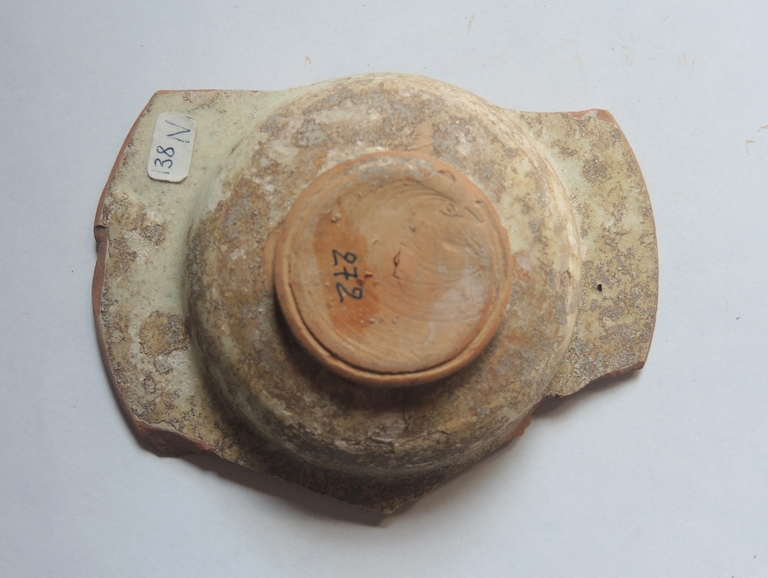 Cavetto decorato con motivo a fiore stilizzato entro medaglione contornato da motivo a cunei. Tesa con decorazione fortemente danneggiata con motivo decorativo composto da fiori stilizzati.