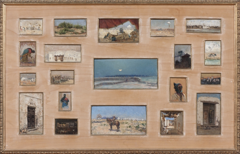 26 gennaio del 1914 il direttore Campori aveva ricevuto dall’artista una memoria autografa con la descrizione dei viaggi compiuti in Africa orientale (ASMCMo, Atti degli anni 1914 al 1920, Protocollo 1914, Carteggio relativo all’acquisto dei Ricordi Eritrei…) e un accurato Elenco dei Bozzetti dipinti a olio, disegni e acquerelli (ASMCMo, Elenchi vari, Elenchi di materiale vario compilati nel periodo 1933/1953…, Bozzetti dipinti a olio…). L’elenco è strutturato in due parti: la prima dedicata a “Disegni ed Acquerelli” raccolti in sei “quadri” e una seconda con l’“Elenco dei Bozzetti dipinti a olio” che registra centododici opere raccolte in undici “tavole”. La condizione attuale non rispecchia più quella suddivisione in undici tavole segnalata dal documento del 1914: cento bozzetti si trovano ora montati in quattro diversi pannelli incorniciati, così sistemati sotto la supervisione dell’artista che ha riportato a matita sul passe-partout i soggetti raffigurati nelle singole tavolette. Non è purtroppo noto il momento in cui avvenne questa nuova sistemazione, ma certamente sappiamo che nell’inventario topografico del 1933 i bozzetti si trovavano già così riordinati, esposti nella Sala II (ASMCMo, Elenchi vari, 1933, Nuovo registro di inventario dei beni mobili). A conferma ulteriore, nell’archivio del Museo è conservata una lettera di Valli del 3 gennaio 1937 che riferisce della nuova incorniciatura, avvenuta con l’accordo di Campori che, come è noto, fu direttore del Museo fino al 1933 (ASMCMo, Atti 1937-1952, Protocollo 1937, lettera 3 gennaio 1937). Il pannello in esame raccoglie un gruppo di venti tavolette eseguite prevalentemente, ma con qualche eccezione, durante i primi due viaggi dell’artista, nel gennaio-giugno 1885, e tra febbraio e ottobre 1886. In entrambi i viaggi, giunto in Africa, è poi costretto a soggiornare per mesi sulla costa, senza avere l’occasione di vedere esaudito il proposito di unirsi a spedizioni per esplorare l’interno. Secondo la memoria autografa citata più sopra, nel primo viaggio l’artista tocca le città di Porto Said, Suez, Suakin, Massaua e Archico; nel secondo viaggio arriva a Aden, nella penisola arabica, poi in Africa a Assab e Massaua dove è costretto a rinunciare al viaggio verso Harar, reso molto sconsigliabile per l’ostilità di alcune tribù somale