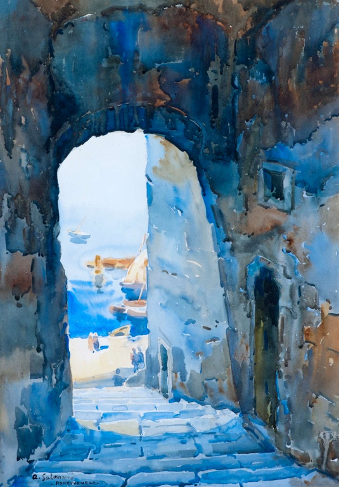 L’acquerello raffigura uno scorcio del mare di Portovenere, colto attraverso un vòlto: il percorso idealmente tracciato conduce dalla penombra di un vicolo al chiarore della luce di una assolata giornata marittima. Il dipinto, un acquerello in buono stato conservativo, come per la maggior parte delle opere del maestro è firmato in basso a destra ma non datato. All’interno del catalogo della mostra livornese del 1932 sono pubblicate molte vedute analoghe, scorci di città attraverso una porta o un arco o un’apertura in generale, come, ad esempio, Case di Portovenere, Vele a Cesenatico, Sottoportico a San Zaccaria (Venezia). Si propone di conseguenza una datazione attorno agli anni Trenta del Ventesimo secolo