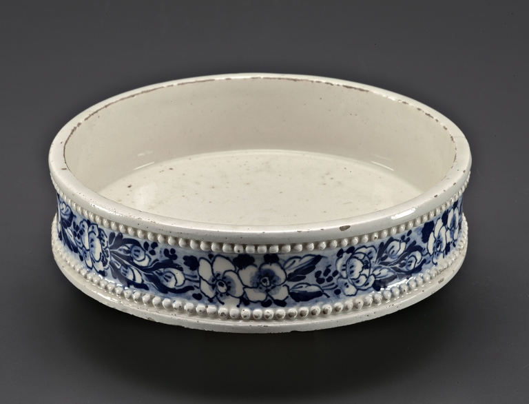 Sottobottiglia di forma cilindrica con piede a disco leggermente concavo. In corrispondenza dell'orlo e del piede cordonatura e giro di 'perline' in rilievo. La parete esterna è decorata da una fascia con motivo a fiori e foglie dipinto in monocromia blu.