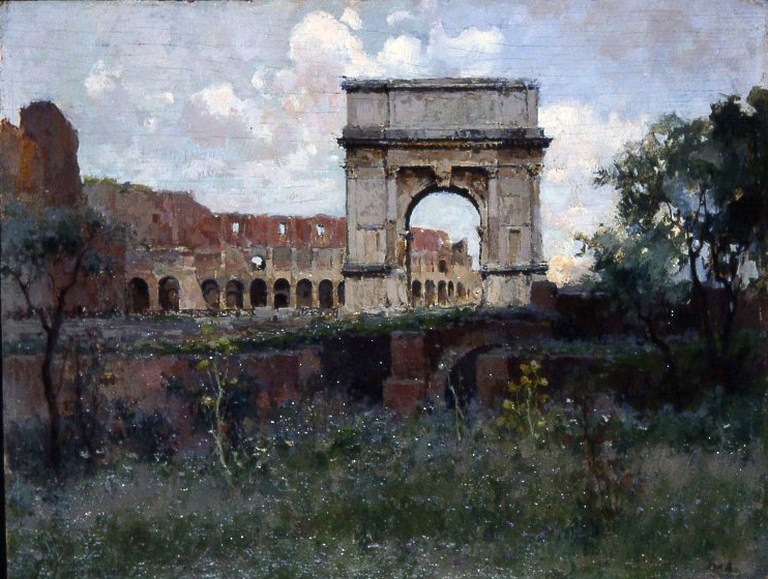 Negli ultimi anni di vita Mentessi realizza una serie di “impressioni romane”, dove la fedele trascrizione delle vestigia di Roma antica è rielaborata attraverso una visione originalissima. Dopo la versione della serie "Roma fantastica" del 1929, oggettiva e immaginifica allo stesso tempo, realizza quest’olio con l’Arco di Tito in primo piano e il Colosseo sullo sfondo. Qui sperimenta gli effetti atmosferici con il sole coperto da nubi sparse, restituendo una luce livida rispetto alla versione "Arco di Tito – Torna il sereno" (n. inv. 0054).