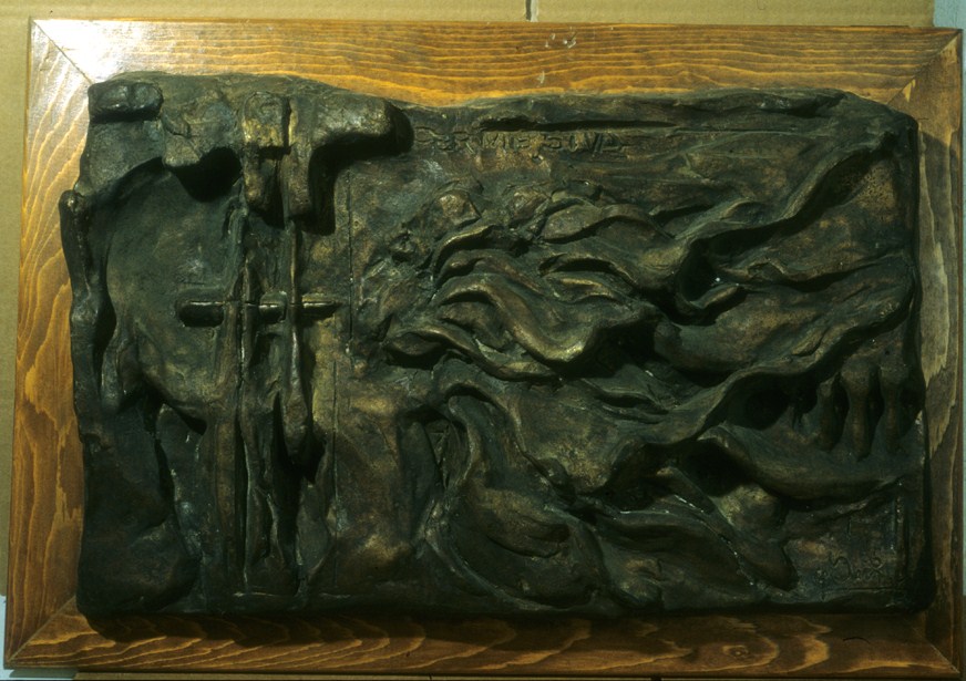 Ad altorilievo, a margini irregolari; composizione allegorica con due figure stilizzate a sinistra e volo d’angeli rappresentato da onde curvilinee.