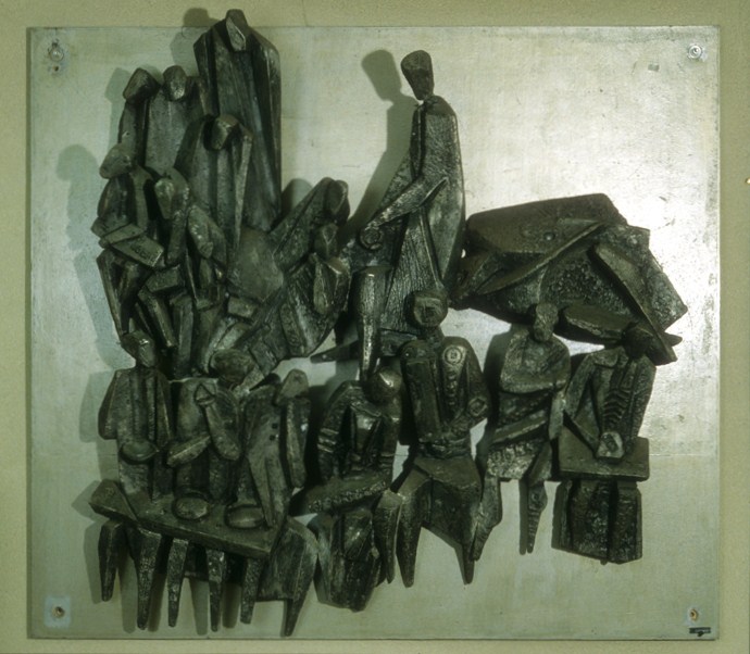 Ad altorilievo applicato su pannello con figure stilizzate a livelli sovrapposti, in occupazioni artigianali