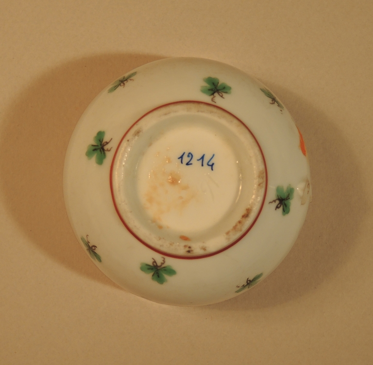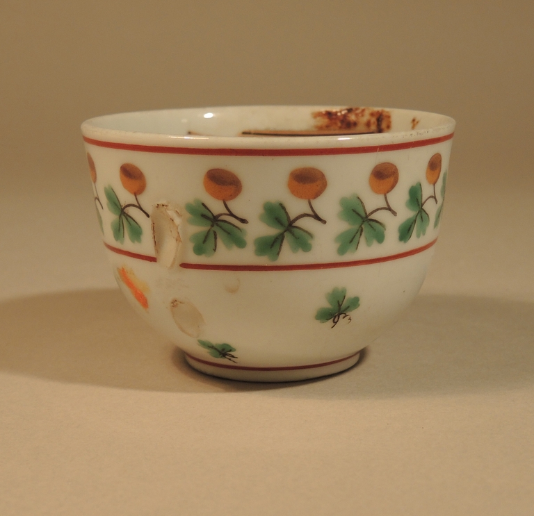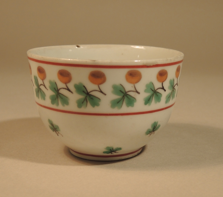 Tazzina a corpo emisferico e piede ad anello. Decorata nella parte superiore da una fascia composta da ghiande e foglioline e nella parte inferiore da motivo a foglioline sparse di quercia. Colori verde, giallo, rosso e bruno.
