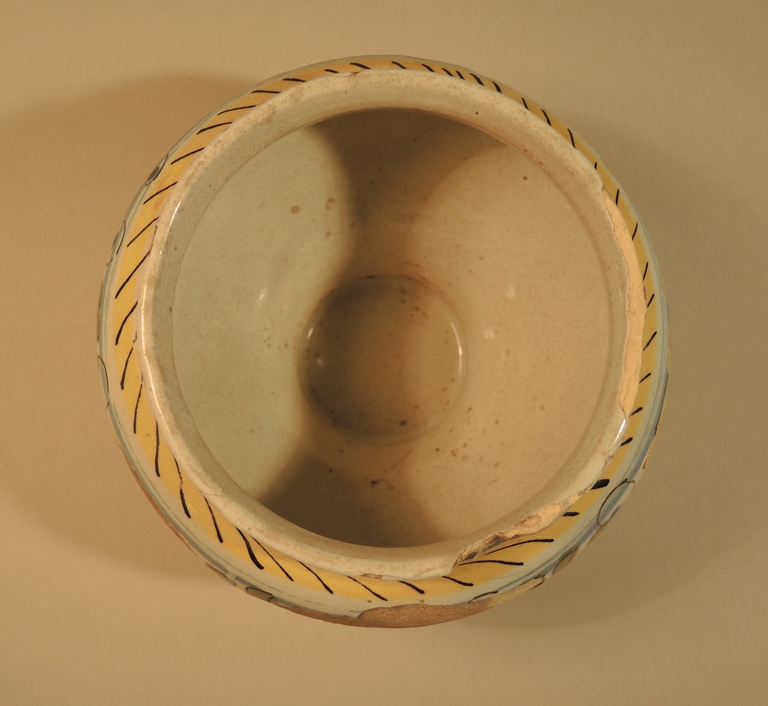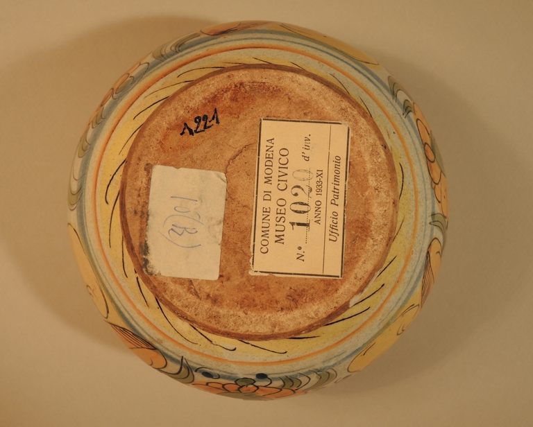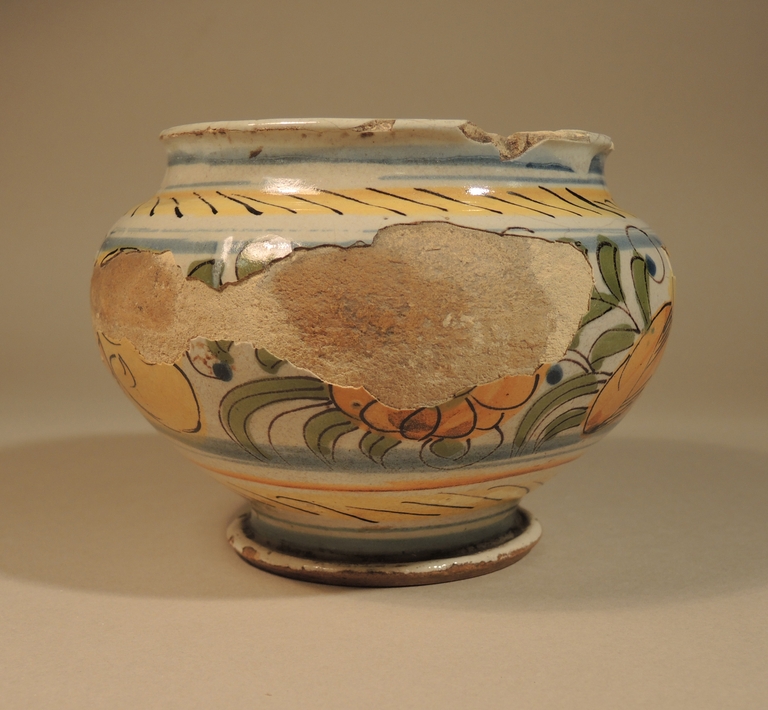 Nella parte del collo e del piede è decorato con fasce di colore contrapposte a motivi geometrici stilizzati. Nella parte centrale, fascia decorata con fiori e frutti. I colori della decorazione sono: bruno, azzurro, verde, arancio e giallo.