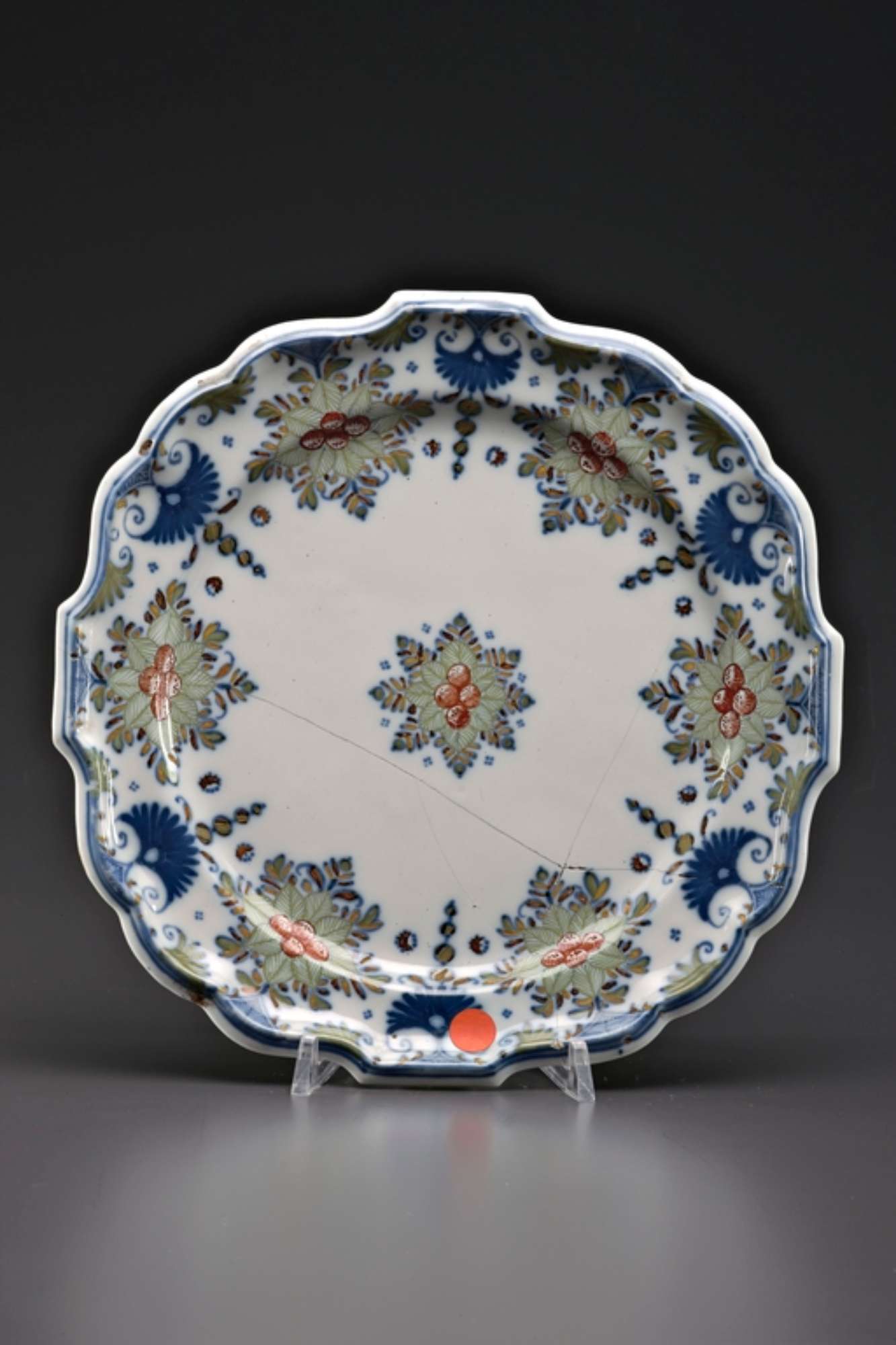 Dalla doppia cordonatura che decora l'orlo si dipartono motivi a ventaglio detti "a Rouen policromo", alternati a cespi vegetali con bacche e foglie; al centro del cavetto motivo a stella con bacche e foglie in azzurro, verde, rosso e giallo.