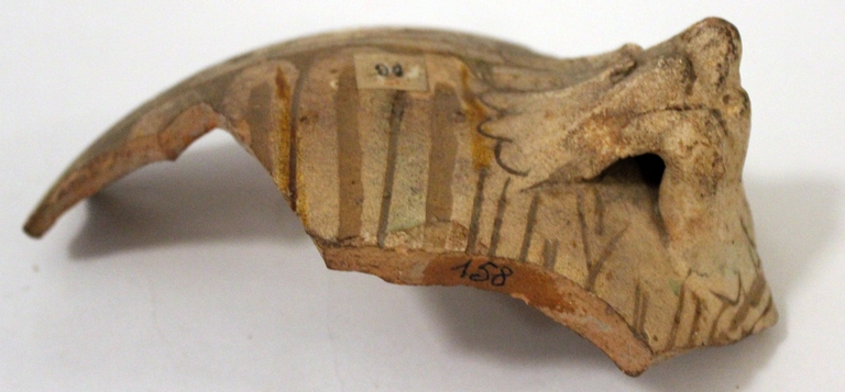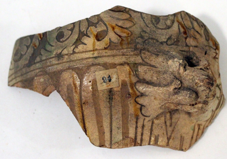 La terracotta è dipinta in verde-ramina e giallo-ferraccia. Decorazione organizzata a fasce, quella inferiore con embrici allungati, quelle centrale a tralcio corrente di foglie lobate; l'unica ansa sopravvissuta è a protome leonina.