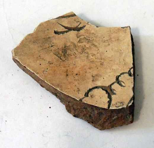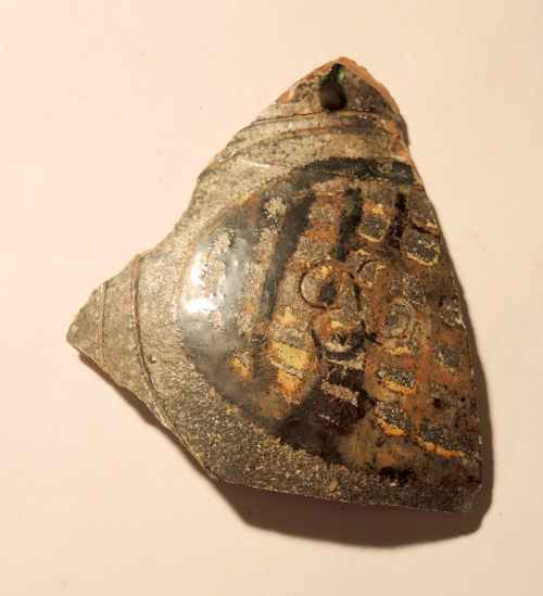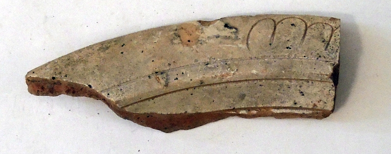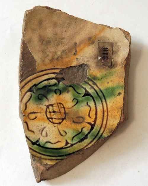 Forma aperta di ceramica ingobbiata, dipinta e invetriata. Vasca emisferica e piede a disco leggermente pronunciato verso l’esterno. Interno decorato da un elemento floro-vegetale centrale, entro cornice lineare seguita da motivo a monticelli (?).