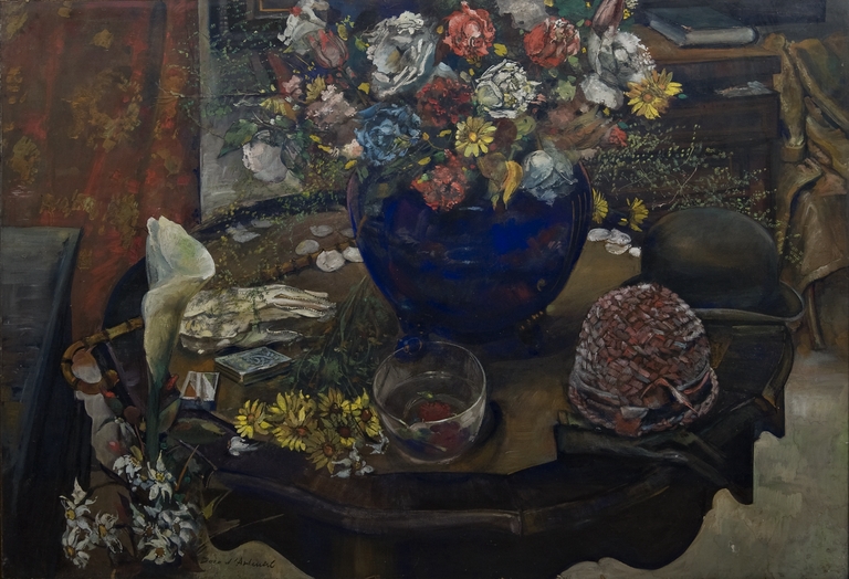 Natura morta di fiori arricchita con particolari legati alla moda del tempo (bombette, guanti, carte, etc.)
