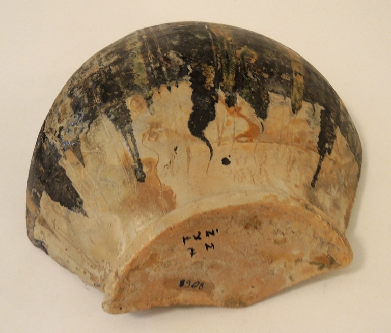 Frammento decorato con motivo geometrico e tracce di verde ramina e giallo ferraccia.