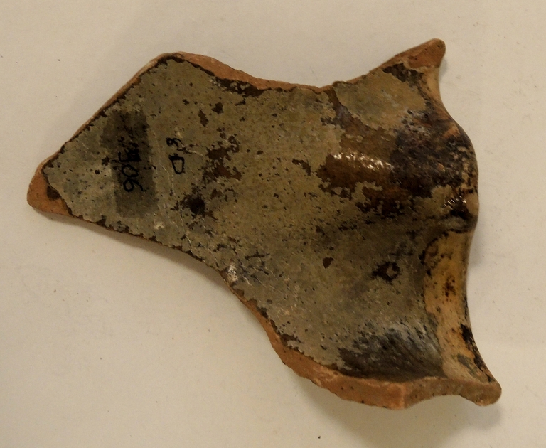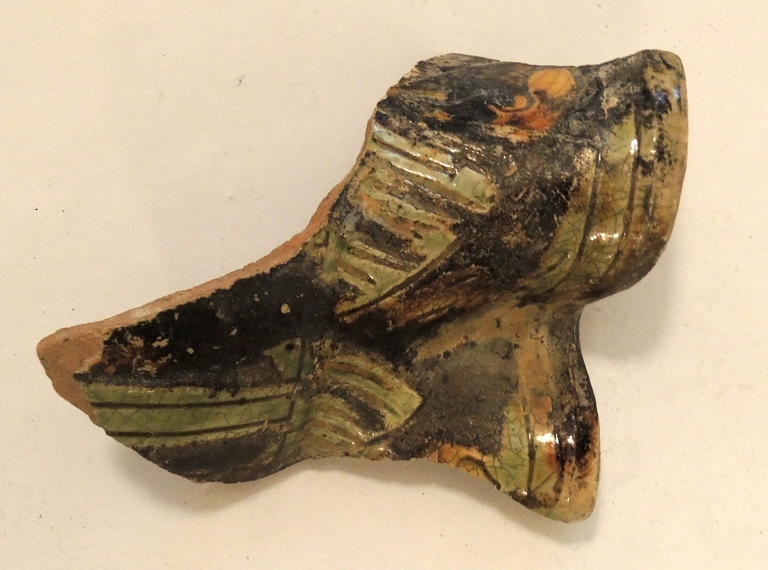 Frammento decorato con motivo geometrico dipinto in verde ramina e giallo ferraccia.