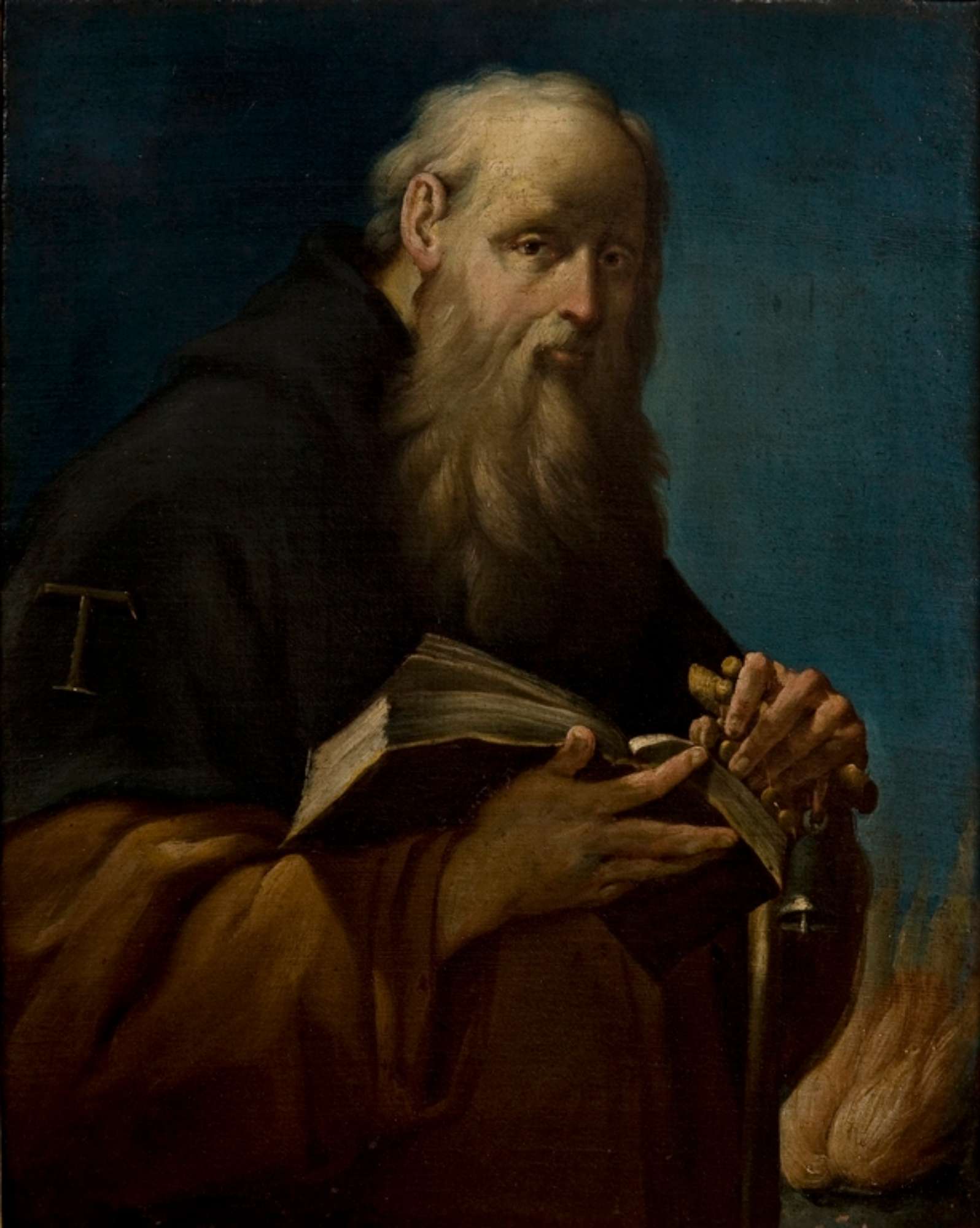 San Antonio Abate, raffigurato, seguendo l'iconografia tradizionale, in età avanzata è in posizione di tre quarti rispetto all'osservatore.