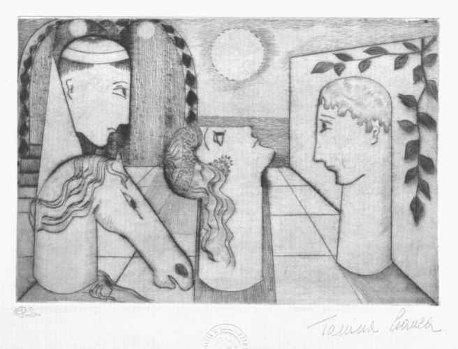 Il dipinto raffigura due volti femminili, l'uno volto a sinistra e l'altro volto a destra, che emergono dalle onde del mare e con sopra i musi di due cavalli.