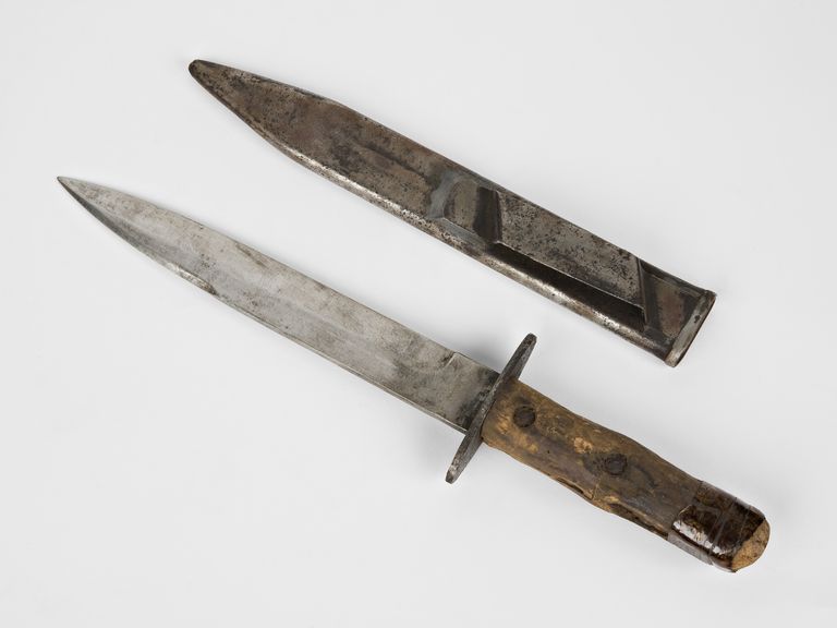 Pugnale in acciaio con spessa lama a fili convergenti, filo e controfilo, che si prolunga in un codolo diritto coperto da due guancette in legno chiaro assicurate da tre rivetti con rosette in ferro; l'impugnatura è lievemente sagomata e arrotondata all'estremità; la piccola guardia è ovale e piuttosto spessa. Il fodero è in acciaio brunito, recante su un lato il largo e sporgente passante per l'inserimento al cinturone.