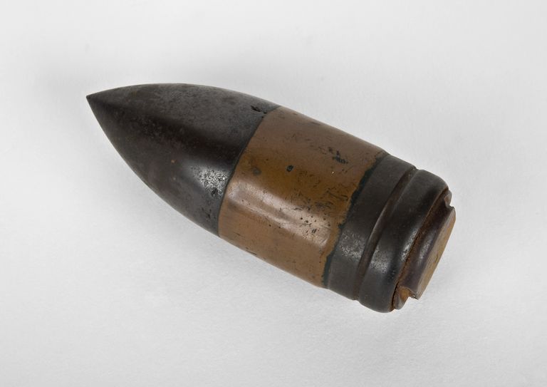 Proiettile da cannone revolver Hotchkiss cal. 37 mm. Il punzone sul fondello, grazie al confronto con esemplari analoghi, sembra indicare come casa produttrice la Società Italiana di munizioni per uso bellico e da caccia Leon Beaux & C. con sede a Milano: fondata nel 1884 come Società Franco Italiana Munizioni (che utilizzava la sigla S.F.I.M), successivamente diventata Società Italiana Munizioni Leon Beaux (S.I.M.) e nel primo ventennio del XX secolo ridefinita Società Leon Beaux Milano (L.B.). La Leon Beaux produsse munizionamenti e accessori per la balistica fino al 1972-73 quando lo stabilimento milanese chiuse.