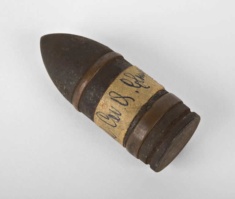 Proiettile cal. 25 mm, detto anche "spaccascudi", per mitragliatrice Nordenfelt a 2 e a 4 canne, arma nata per la Marina (installata a bordo delle navi e sulle postazioni fisse costiere) ma utilizzata durante la prima guerra mondiale anche dal Reale Esercito Italiano come cannoncino da trincea. Come mostra l'etichetta cartacea incollata sulla fascia centrale, la cartuccia in esame fu donata al museo dal cavalier A. Colonnelli in data non precisata; su di essa è visibile solo in parte un'iscrizione riguardante la produzione.