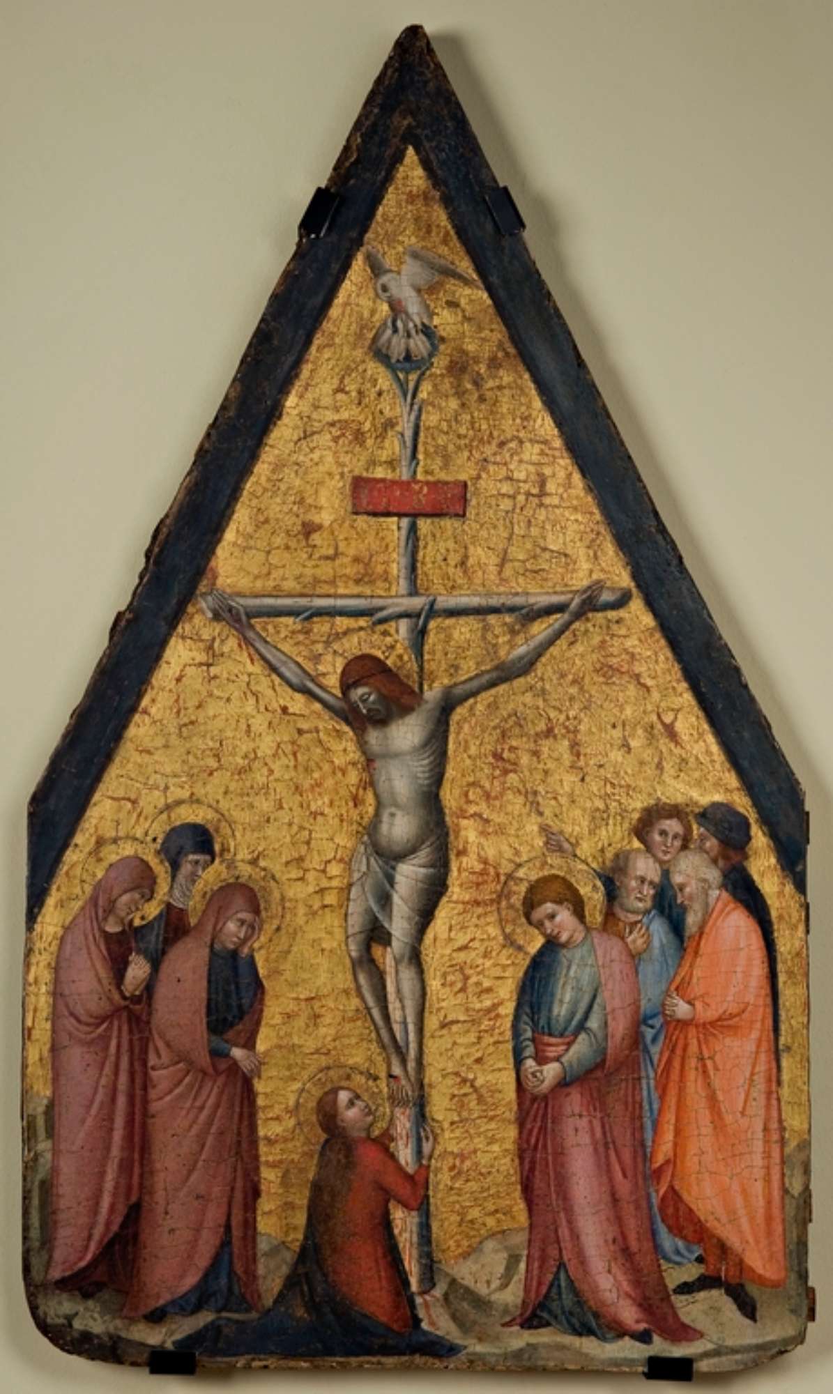 Al centro della cuspide è raffigurato Cristo crocifisso ad una altissima croce. Al di sopra del corpo livido e allungato di Gesù morto compaiono la targa rossa con la scritta INRI (Iesus Nazarenus Rex Iudeorum) in caratteri capitali romani dorati e all'estremità superiore del legno un pellicano che si squarcia il petto, noto simbolo simbolo cristologico. In basso la Maddalena inginocchiata abbraccia il fusto della croce e sembra quasi intenta a baciare i piedi sanguinanti del Redentore. A sinistra compaiono le Pie donne, visibilmente turbate dal dolore, ma moderate nelle loro manifestazioni esteriori, al punto che è assente l'episodio, usuale nella tradizione giottesca, dello svenimento di Maria, la quale è raffigurata in secondo piano e semi nascosta dalle aureole delle due donne che le stanno davanti. A destra è raffigurato San Giovanni pacatamente piegato dal cordoglio e, dietro di lui, quattro personaggi maschili che commentano l'evento. “In questo brano affiora bene la vena cronachistica di Bitino, che indugia sulla mimica e sulla caratterizzazione delle fisionomie: più solenni i due anziani in primo piano, di una gravità giottesca[…]”(A. Tambini, Bitino da Faenza, pittore di Rimini, in “L'Arco”, 8 2010, 1/3, p. 18)”. Di questi ultimi due quello più giovane ha il braccio teso ad indicare il Cristo crocifisso.