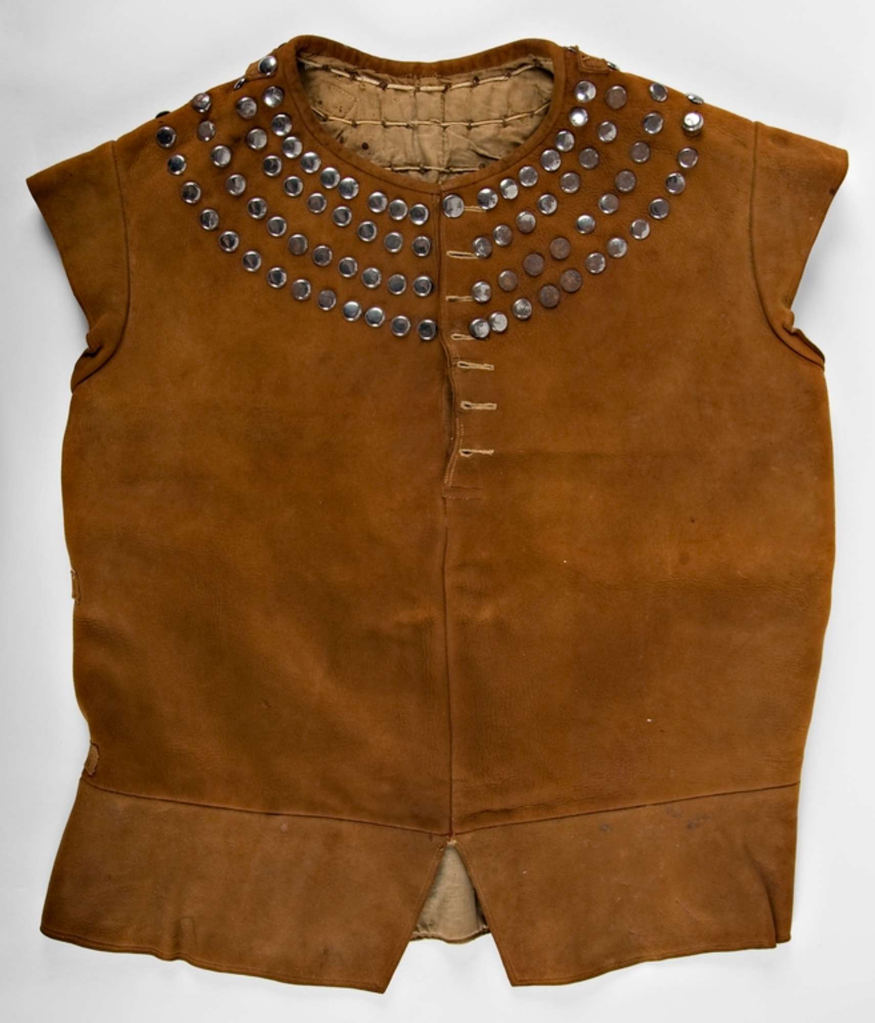 Corsetto di pelle marrone con quadruplice fila di borchie al girocollo e sette asole per l'apertura fino a mezzo busto, con ogni probabilità parte di un costume di scena, forse associabile al personaggio del Duca di Mantova nell'opera "Rigoletto" di Verdi.