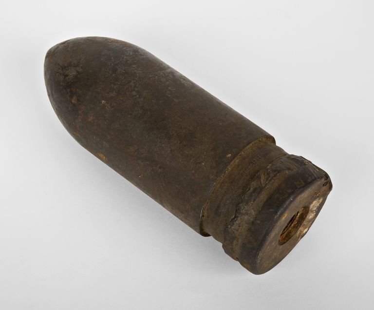 Pesante proiettile da cannone in acciaio cal. 75 mm, cavo sul fondello e caratterizzato nella parte bassa da una fascia zigrinata e da una doppia scanalatura. Sul fondello è ripetuto due volte il numero "326".