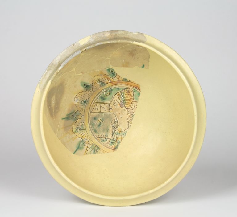 Sul verso è inserita una ghirlanda con tralci di foglie a quadrifoglio. All'interno del piede è graffito e dipinto un busto di donna con i capelli raccolti in una cuffia a rete e un abito ad ampia scollatura.