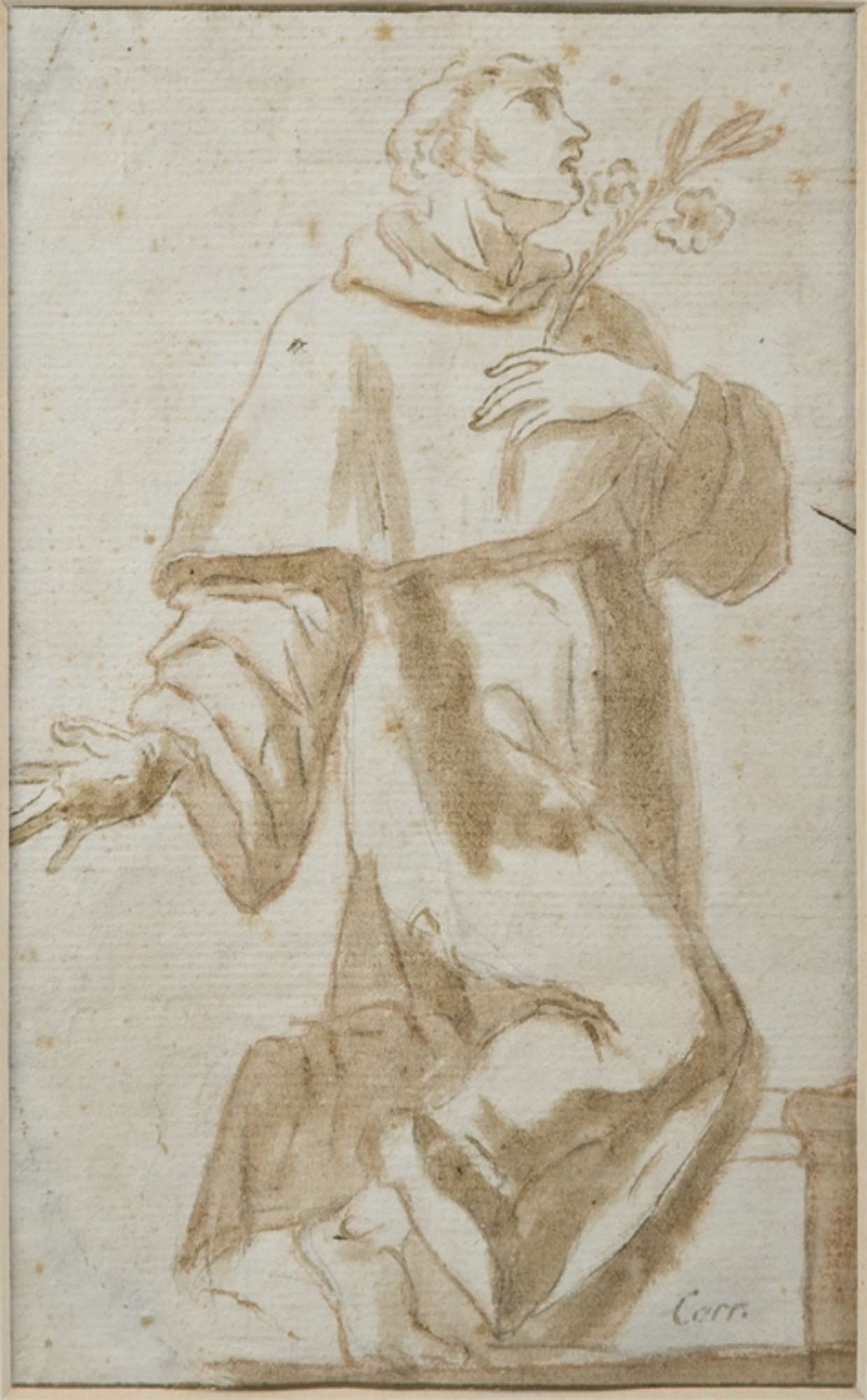 Questa immagine del santo di Padova ha conosciuto fortuna nell'ambito dell'iconografia a carattere sacro, con particolare riferimento all'area veneta ed emiliana. Alla tradizione delle grandi pale devozionali rinvia questo schizzo a sanguigna, ripassato a inchiostro bruno, svelto nel tratto sinuoso e tale da fare ritenere possa essere di area bolognese. E' certamente tratto dall'immagine del san Francesco nella pala omonima collocata in san Francesco a Correggio sino al 1638, quindi trasferita a Modena e poi a Dresda – a seguito dell'acquisto dei quadri estensi da parte di Augusto III – dove si trova ancora nella locale Gemäldegalerie. Sono uniche varianti il braccio e la mano destra rivolti verso l'esterno e il fatto che il francescano abbia l'abito dei frati conventuali e regga il giglio che nella pala correggesca è attributo del' sant'Antonio posto a sinistra della Vergine in maestà, con un curioso scambio di attributi col san Francesco. La derivazione della pala correggesca è rivelata dalla ripresa del gradino del piedistallo del trono della vergine, in basso a destra. Il piccolo disegno Stuard potrebbe essere di autore emiliano, verosimilmente bolognese, degli inizi del XVII secolo.