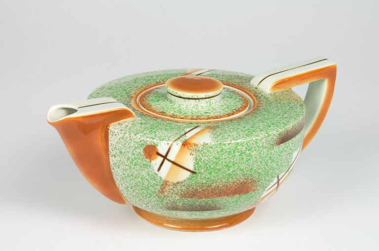 Teiera a parete emisferica, con coperchio piatto e pomello circolare schiacciato, dotata di manico dal profilo concavo e beccuccio aggettante. Decorata a spruzzo in verde e marrone con decori geometrici astratti ottenuti da sagome.