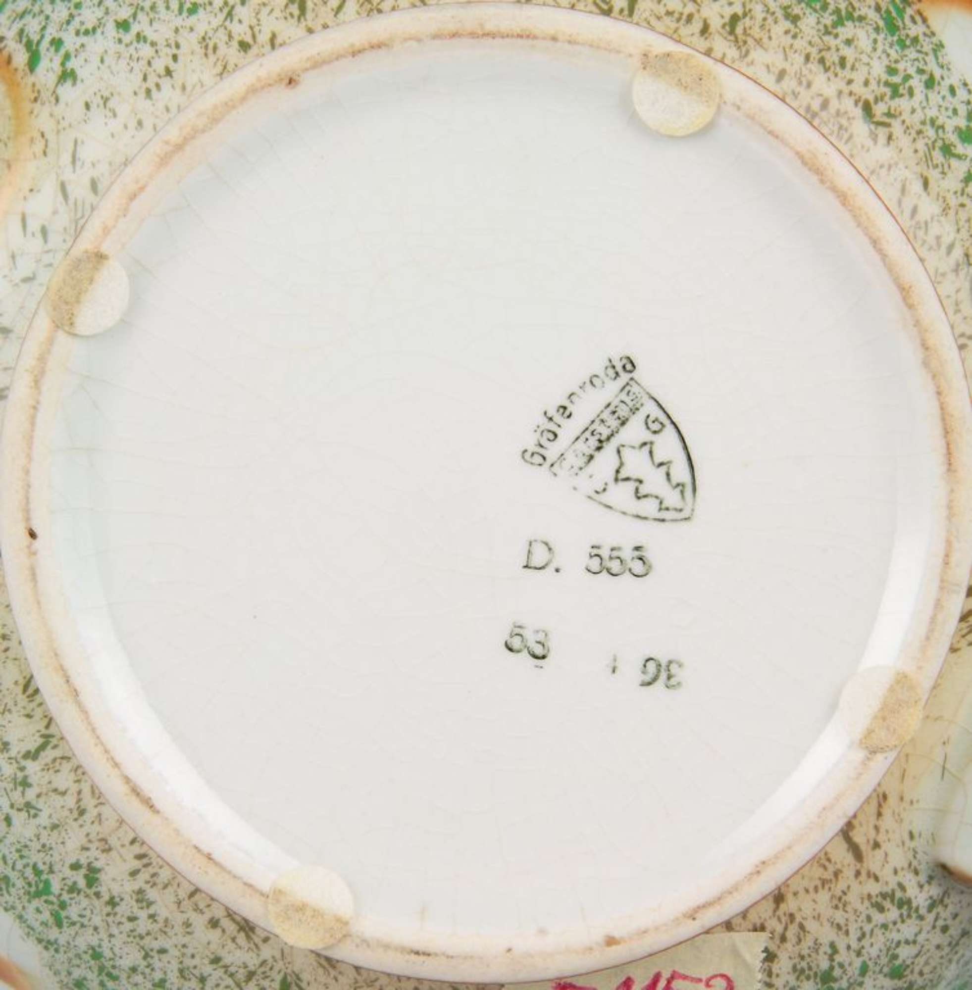 Sul piede è inserito il timbro nero dell'azienda e il numero identificatico della decorazione "D. 555", insieme ai numeri "53", "36".