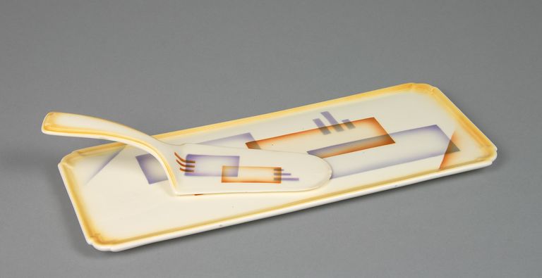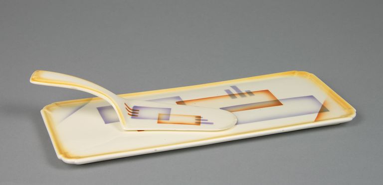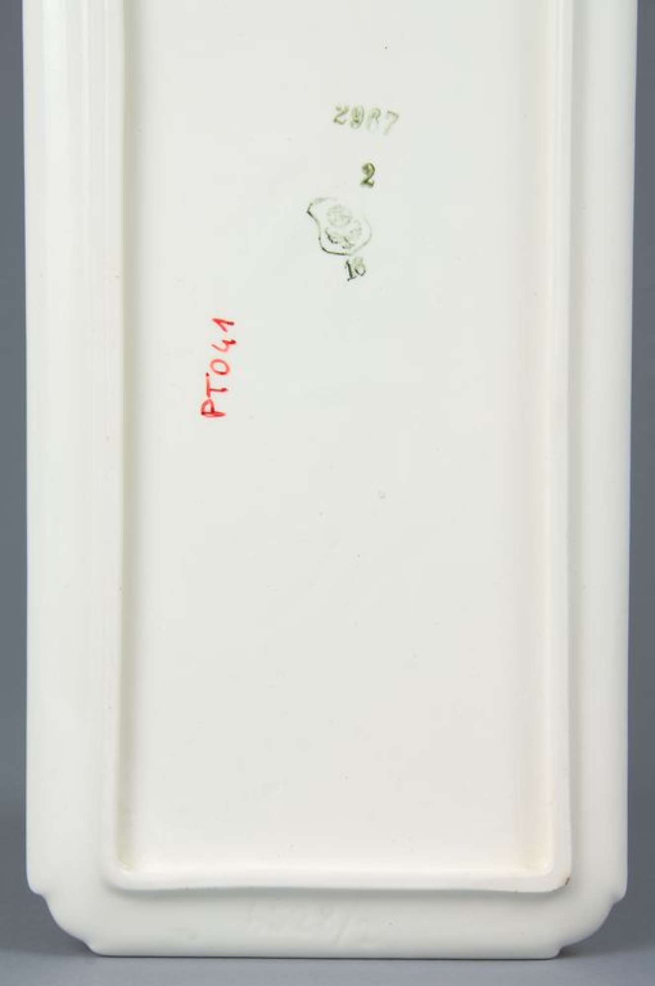 Vassoio rettangolare liscio con angoli sagomati. Decorazione a spruzzo con motivi geometrici rettangolari in arancio, giallo e viola. Sul retro sono inseriti: un timbro con il marchio della fabbrica con il numero "16", un timbro con il numero "2967/2" e il numero "6528/2" impresso.