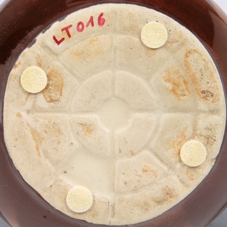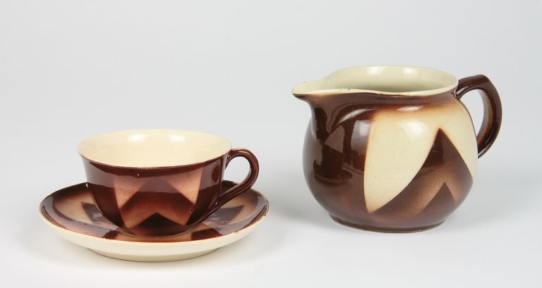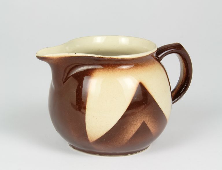 Lattiera dal corpo globulare, dotata di corto versatore e manico dal profilo lobato. Decorazione a spruzzo, tramite l'uso di sagome, in marrone su fondo beige.