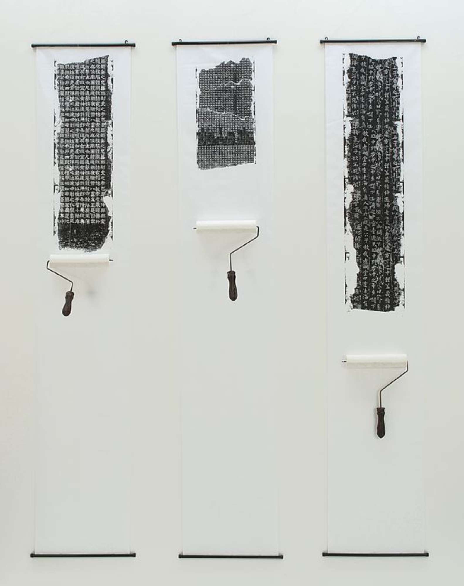 Installazione costituita da tre pannelli di tessuto stampato con scritte bianche in caratteri cinesi su fondo nero e tre rulli bianchi in ceramica e metallo.