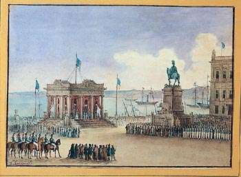 L'identificazione della piazza sostituisce quella tradizionale che indicava nell'acquerello "Piazza Maggiore" a Trieste (in realtà la denominazione corretta sarebbe "Piazza Grande", ora "Piazza Unità"), errore nato con ogni probabilità dalla somiglianza dei golfi delle due città. Praça do Comercio (il nome popolare ha ormai sostituito quello ufficiale di Terreiro do Paço, Terrazzo del Palazzo) si affaccia sul fiume Tago ed ospitava fin dal 1500 il palazzo reale chiamato Paço da Ribeira. In seguito al violento maremoto del 1755 la piazza, che seguiva un modello francese alla Luigi XIV, dovette essere risistemata all'interno di un rinnovo urbanistico dell'intera città, e ai suoi lati vennero innalzate due torrette, di cui una raffigurata nel dipinto, prospicienti il mare a ricordo dell'antico Palazzo Ribeira. Sulla destra è visibile la statua equestre dedicata al re Giuseppe I (1714-1777); inaugurata nel 1775, era opera dello scultore Machado de Castro. La base, affiancata da elefanti (probabilmente inseriti per ragioni di ordine statico), presenta allegorie che alludono all'impero marittimo portoghese; il cavallo invece calpesta i serpenti simbolo di insidia. Nel 1908, nella stessa piazza, si consumò il regicidio di Carlo I e dell'erede al trono, mentre rimase ferito il figlio minore Emanuele, ultimo sovrano della nazione che dal 1910 divenne repubblica. Oggi non resta traccia dell'altra architettura presente nel dipinto, un tempietto sopraelevato, certo da interpretarsi come edificio effimero eretto in occasione di qualche evento rilevante; non è da escludersi che il soggetto del quadro sia in relazione alle celebrazioni del maggio 1886, legate al matrimonio di Carlo, erede al trono di Portogallo e figlio del re Luigi I e della regina Maria Pia di Savoia, con Amelia d'Orleans.