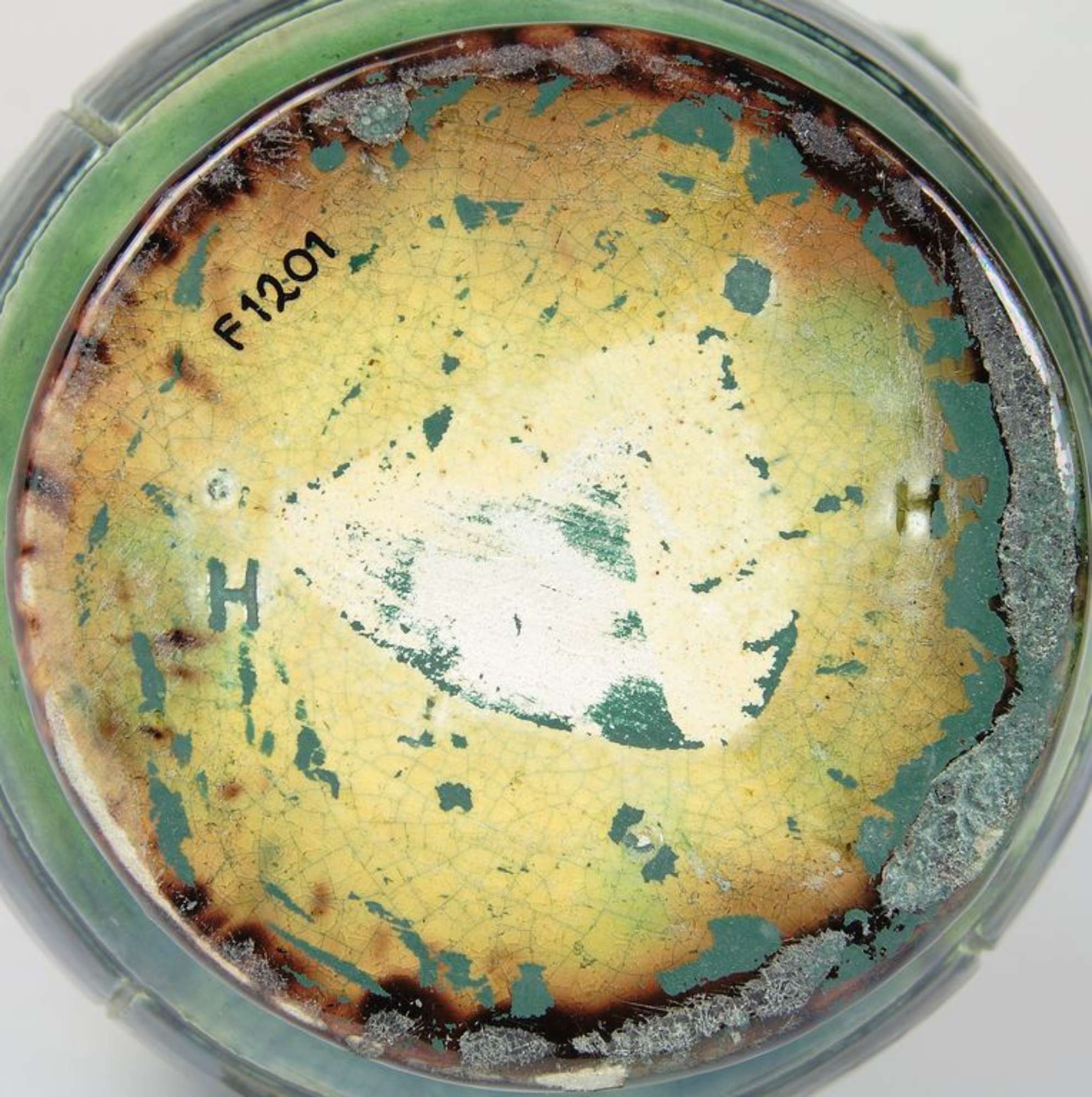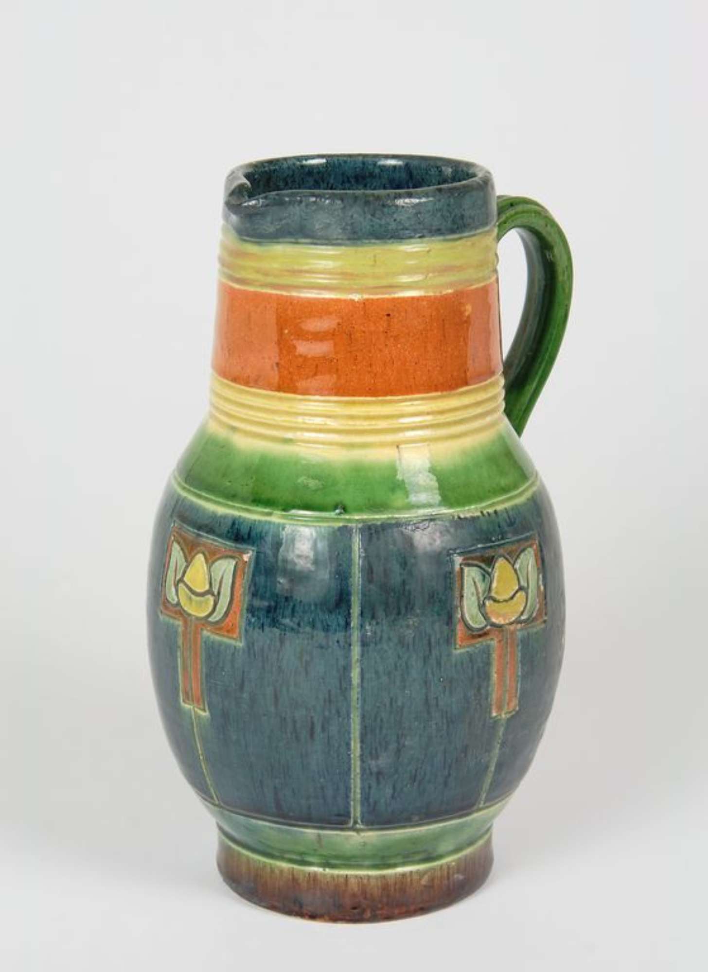Boccale a ventre ovoidale con ansa verticale; decorata a motivi vegetali (ghiande) in rilievo entro scomparti incisi, con rivestimento a vetrine colorate su sfondo blu. Sotto al piede due H incise.
