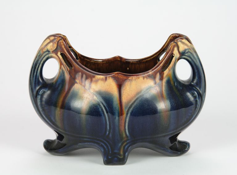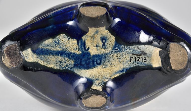 Cache-pot ovale sagomato con rivestimento screziato dal marrone al blu. Numeri impressi sotto la base.