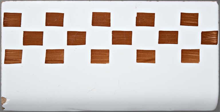 Listello per bordature con bordo a becco di civetta decorato con motivo geometrico a quadri. Sul retro marca "Ing. Siliprandi, Sassuolo". Decorato in marrone sopra smalto bianco.