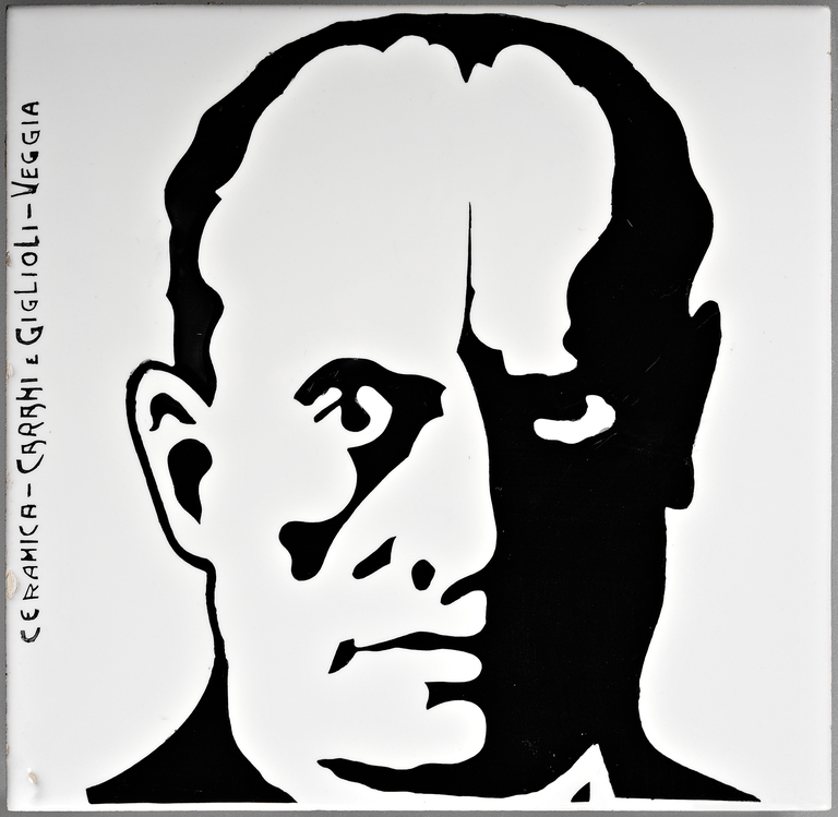 Piastrella con ritratto del Duce. Decorazione a mascherina in nero, sopra smalto bianco.
