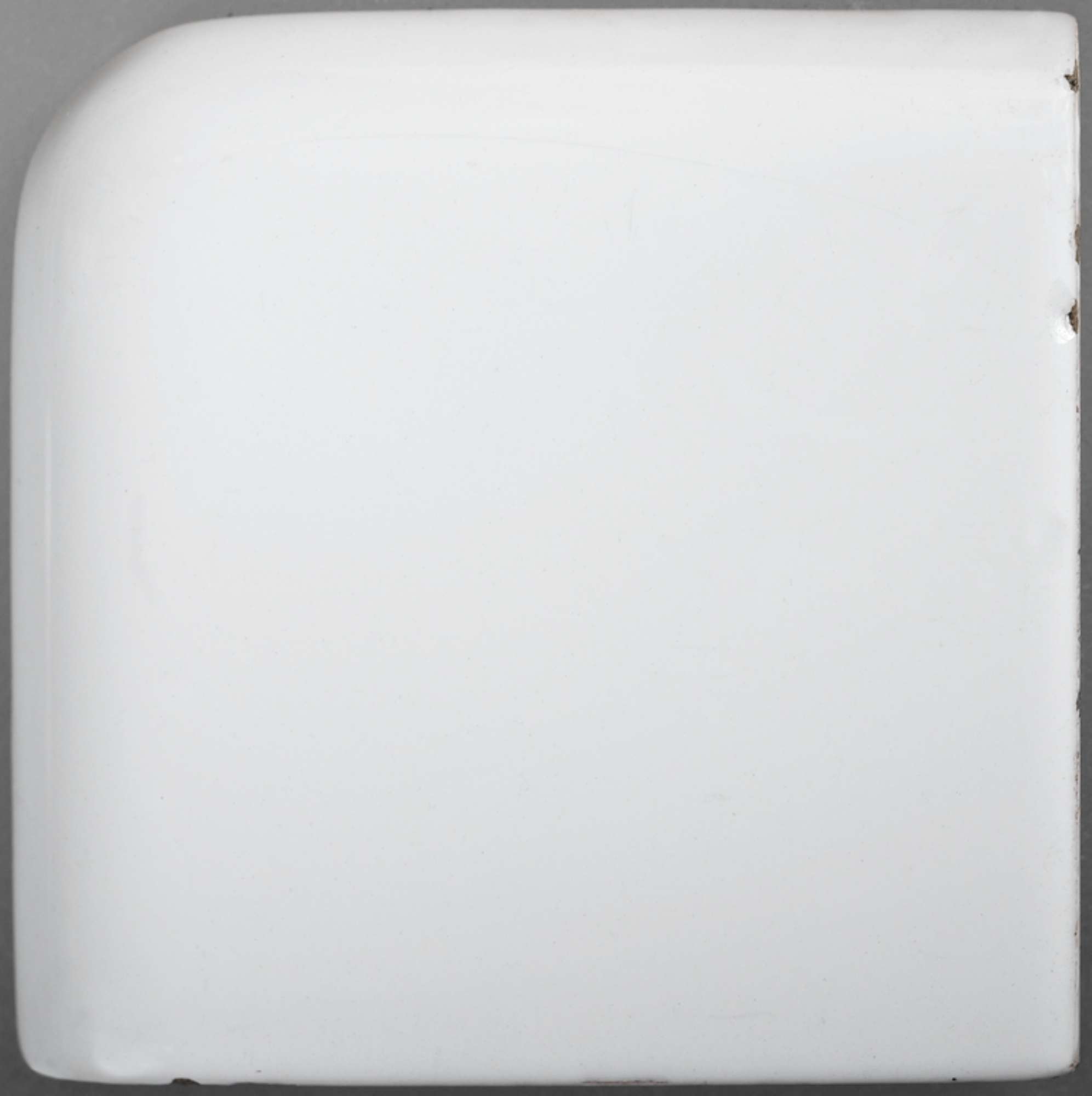 Tozzetto d'angolo con becco di civetta su due lati; smalto bianco. Sul retro marca "Ing. C. Siliprandi & C., Sassuolo".
