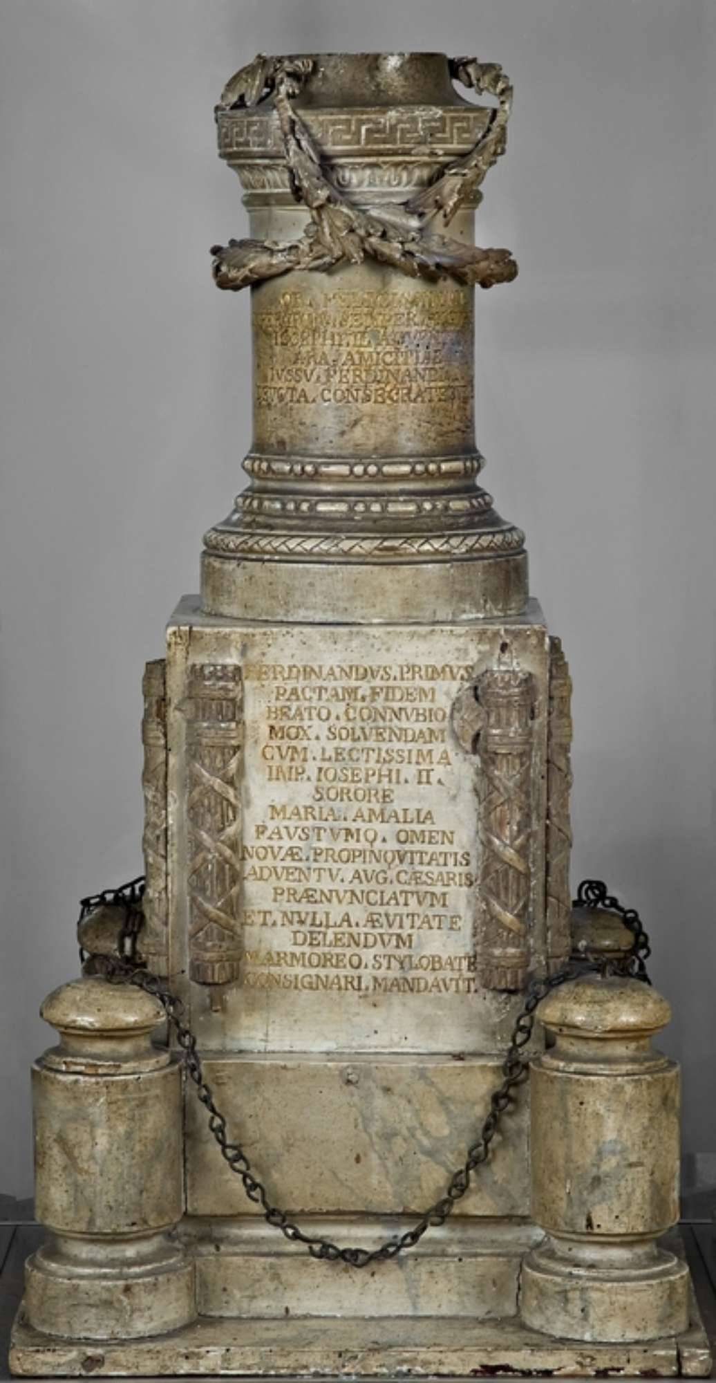Trascrizione: FERDINANDUS . I / PACTAM . FIDEM / BEATO . CONNVBIO / MOX . SOLVENDAM / CVM . LECTISSIMA / IMP . JOSEPHI . Il / SORORE / MARIA . AMALIA / FAVSTVM . QUE OMEN / NOVAE . PROPINQVITATIS / ADVENTV . AUG . CAESARIS. / PRAENVNTIATVM / ET . NULLA . AEVITATE. / DELENDVM / MARMOREO . STYLOBATAE / CONSIGNARI . MANDAVIT