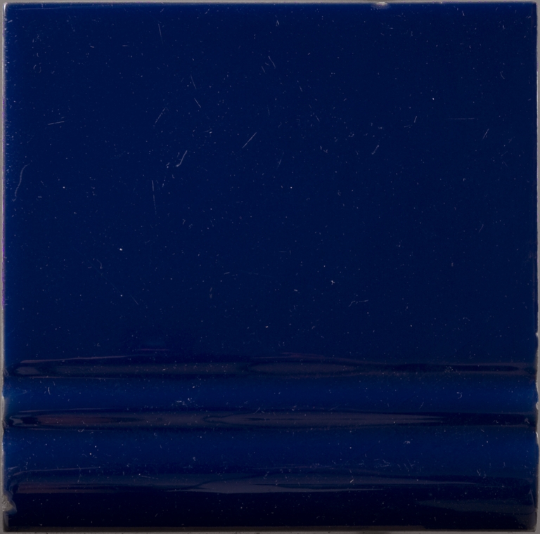 Piastrella di finitura con becco di civetta e 3 solcature orizzontali parallele: smalto blu cobalto- Sul retro, marca “Ing. C.Siliprandi & C., Sassuolo”.