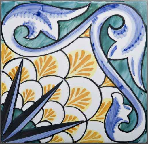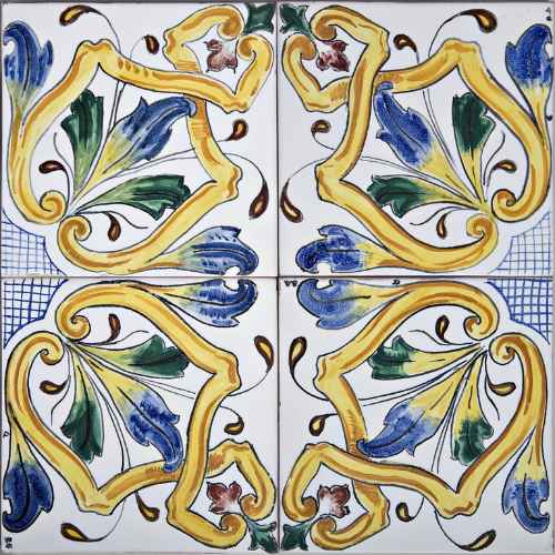 Pannello composto da 16 piastrelle per pavimento decorate con disegno ripetitivo a volute e rosoni.