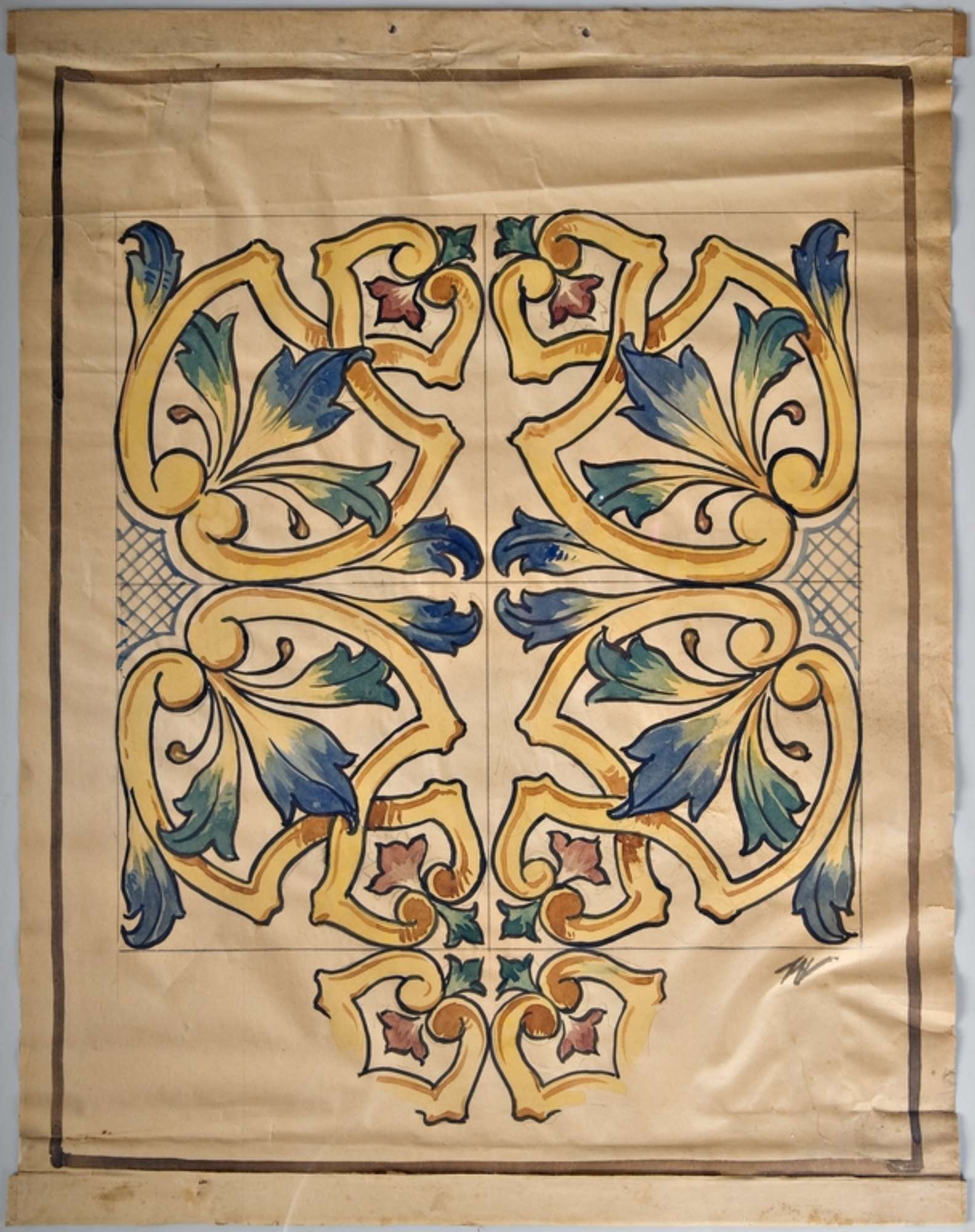Composizione per decoro ceramico su piastrelle. Acquerello con decoro a volute e fogliami.