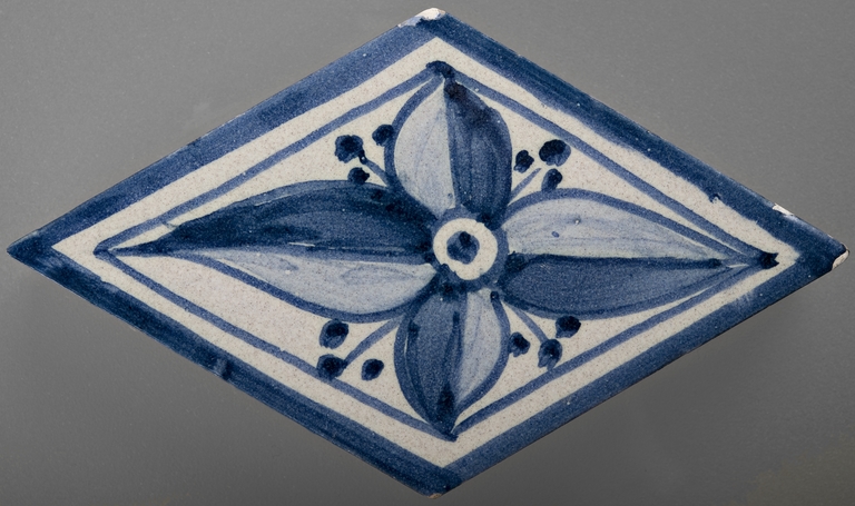 piastrella B: decorazione con un fiore a quatto petali posto entro una cornice a rombo.